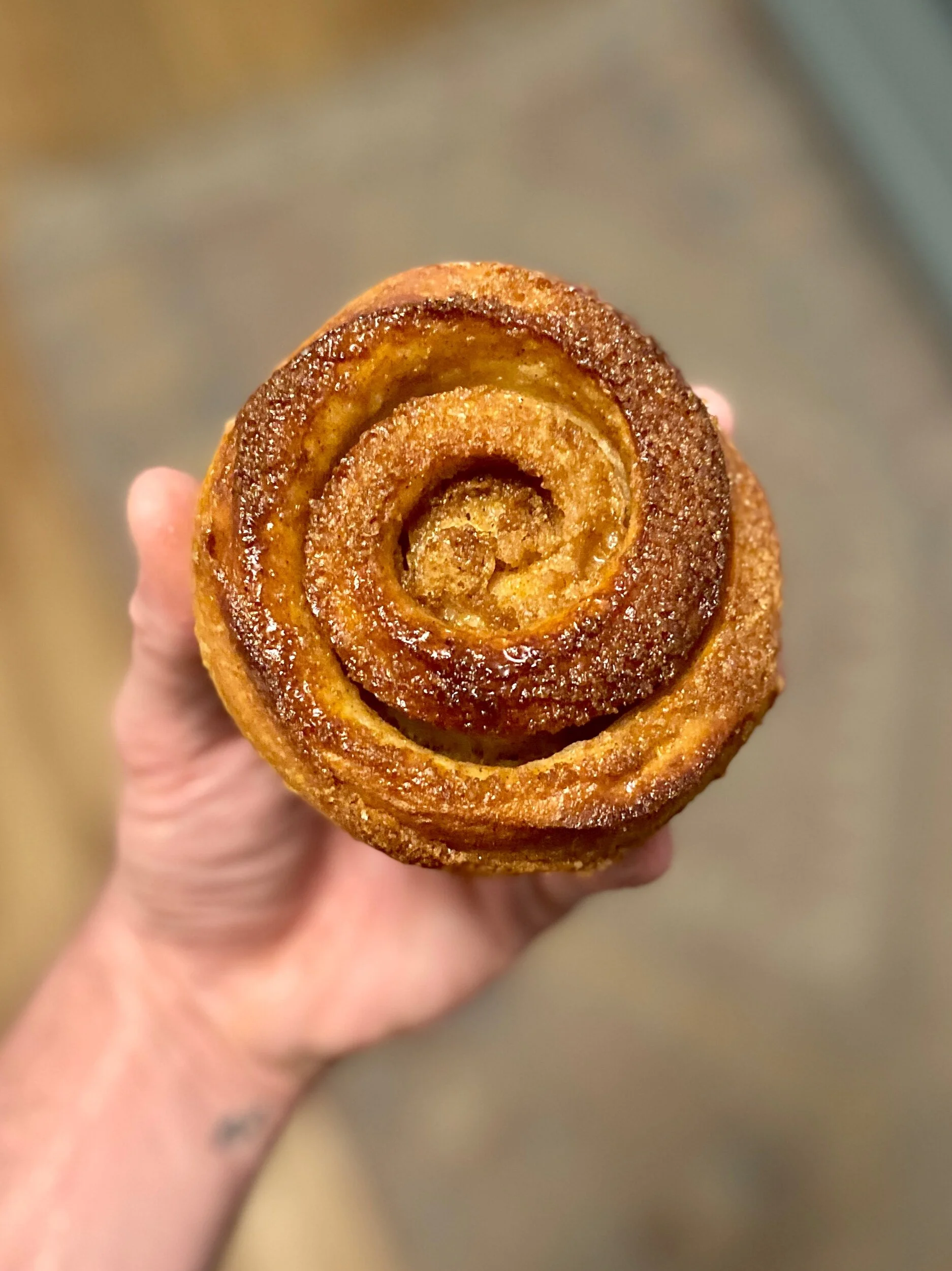 Brioche Dough consisting of 100% Organic Flour Blend featuring whole wheat, eggs, sugar, butter, salt and wild yeast that is layered with Cinnamon, brown sugar and butter. Rolled, baked and glazed with a Maple Bourbon glaze.