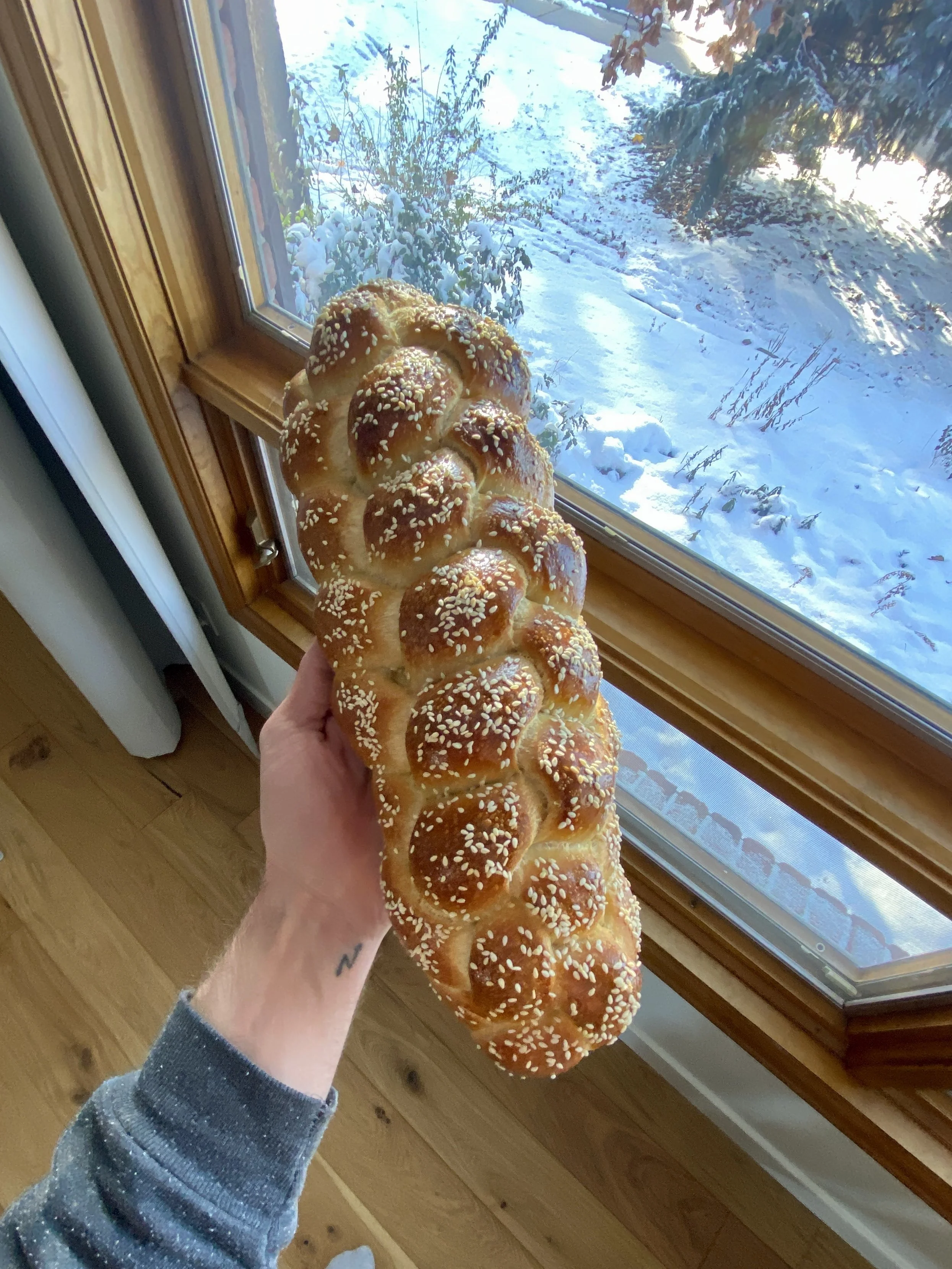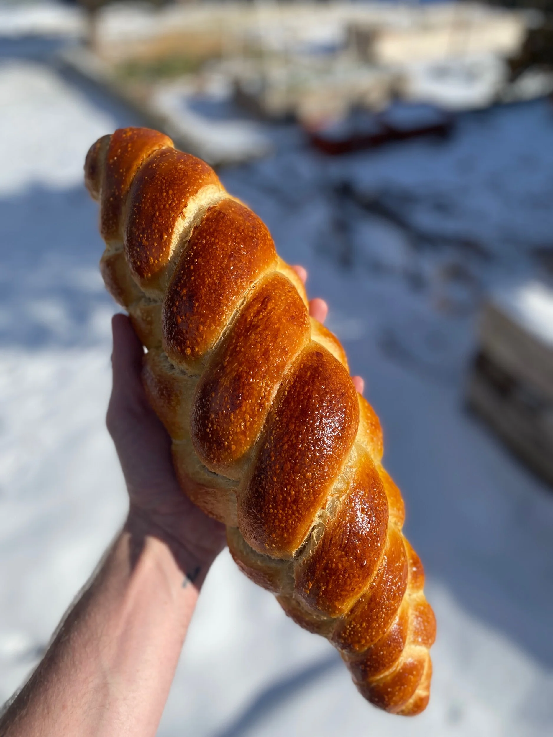 100% Organic Flour blend featuring 10% Whole Wheat, Egg, Colorado Honey, Olive Oil, Salt, and wild yeast. Braided and then baked.