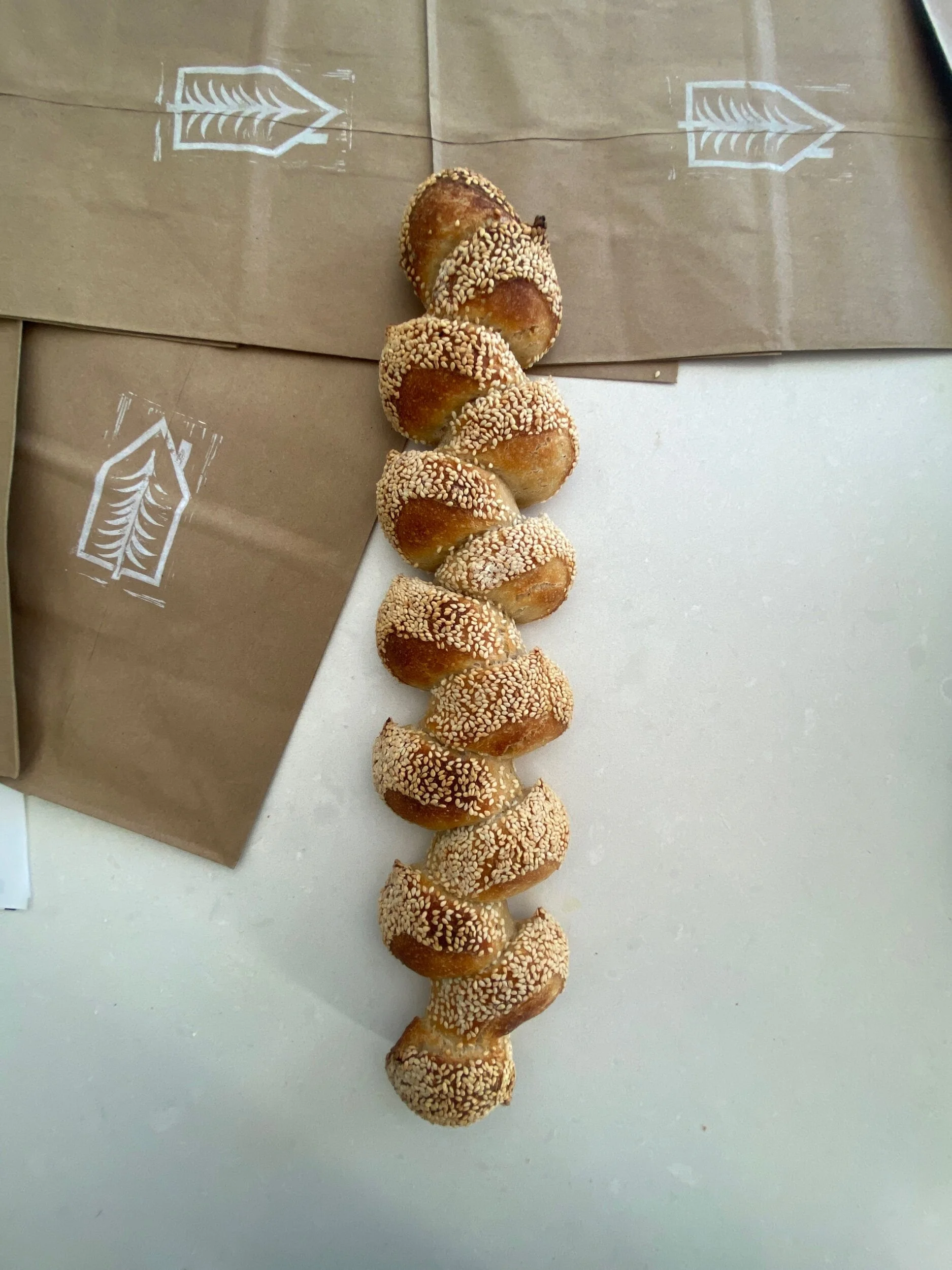 100% organic flour blend featuring semolina, salt, water, wild yeast topped with sesame seeds